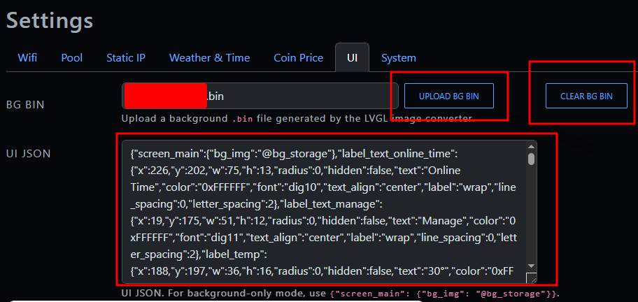 If you only want to change the background, you will need to generate and upload the bg.bin file, then enter the following in the UI JSON field:
